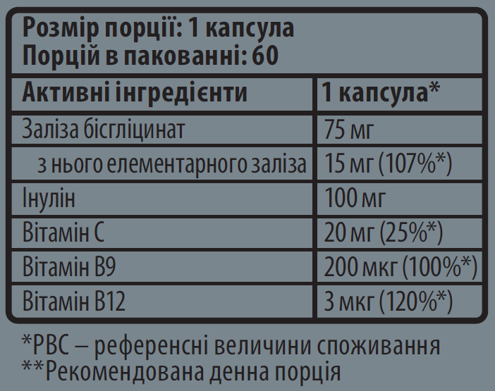 Состав: инулин, железа бисглицинат, витамин С (Аскорбиновая кислота), кальция стеарат, оболочка капсулы: желатин; краситель: диоксид титана; витамин B9 (кальция L-метилфолат), витамин B12 (метилкобаламин).