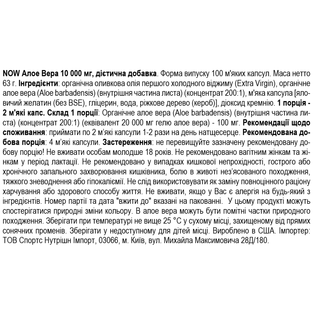 Состав NOW Foods Aloe Vera 10000 - 100 софт гель