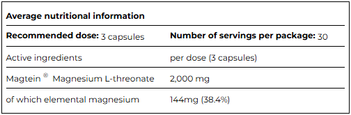 Ингредиенты: L-треонат магния (Magtein®), растительная капсула (гидроксипропилметилцеллюлоза, очищенная вода, краситель: карбонат кальция), средства против слеживания: магниевые соли жирных кислот и диоксид кремния.