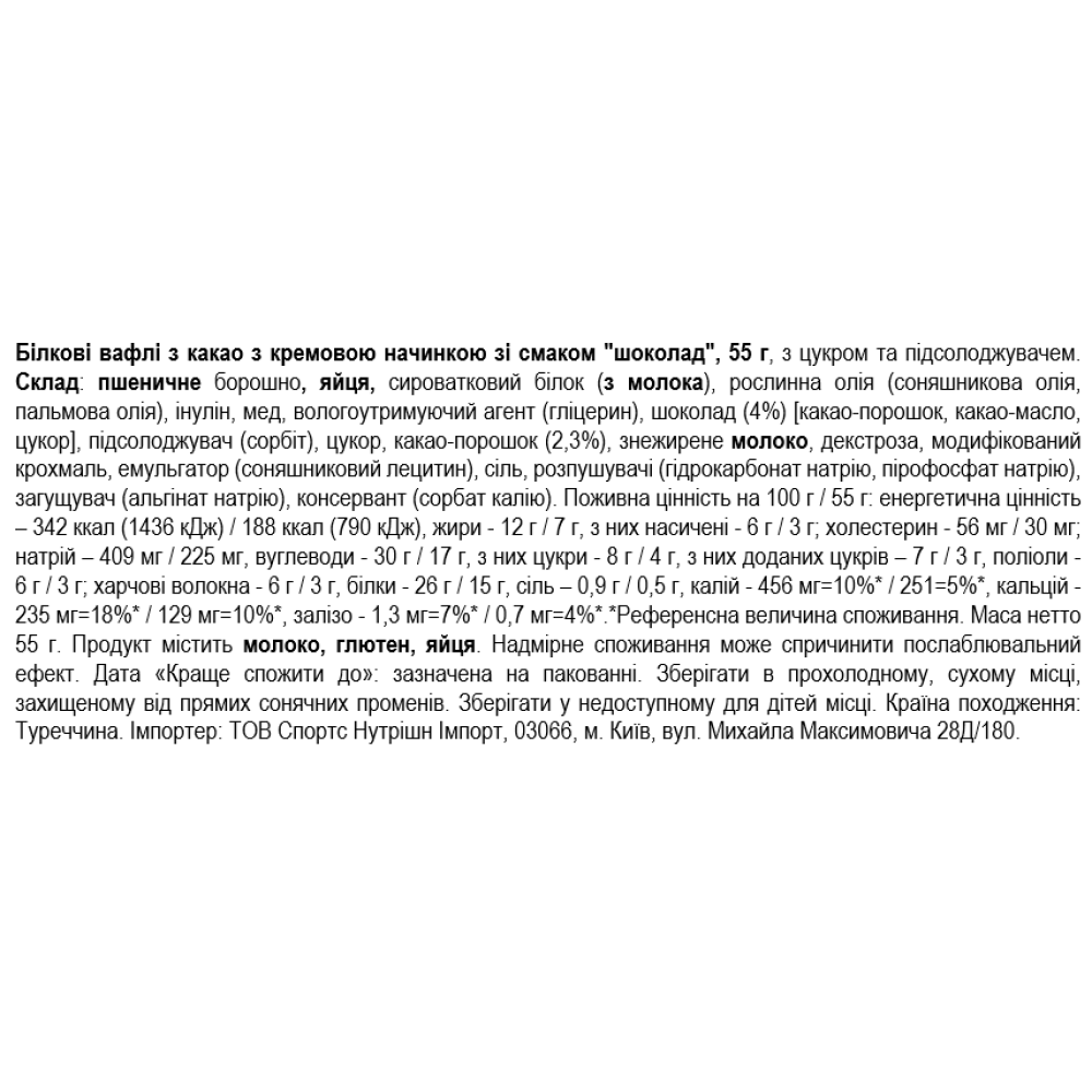 - Удобство и мобильность: Формат 55 г оптимален для использования в условиях ограниченного времени. Вафля легко помещается в сумку или рюкзак, становясь удобным дополнением к рациону после физической активности, в офисе или во время поездок.