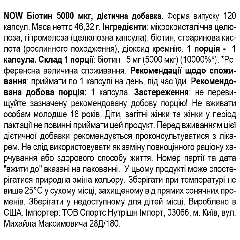Состав NOW Foods BIOTIN 5MG (5000 мкг) 120 веган капс