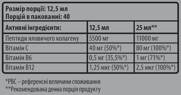 Состав: Вода очищенная, пептиды говяжьего коллагена и типа Peptolap Light, аскорбиновая кислота (витамин С), ароматизатор лесные ягоды, лимонная кислота, сукралоза, низин Е234, пиридоксина гидрохлорид (витамин В6), цианокобаламин (витамин В12).
