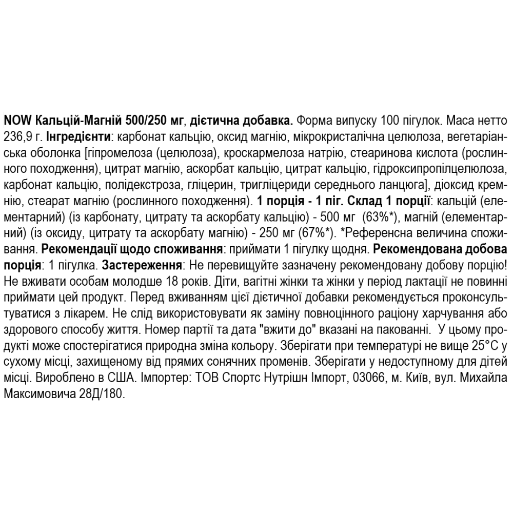 Состав NOW Foods Calcium & Magnesium 500/250 мг - 100 таб