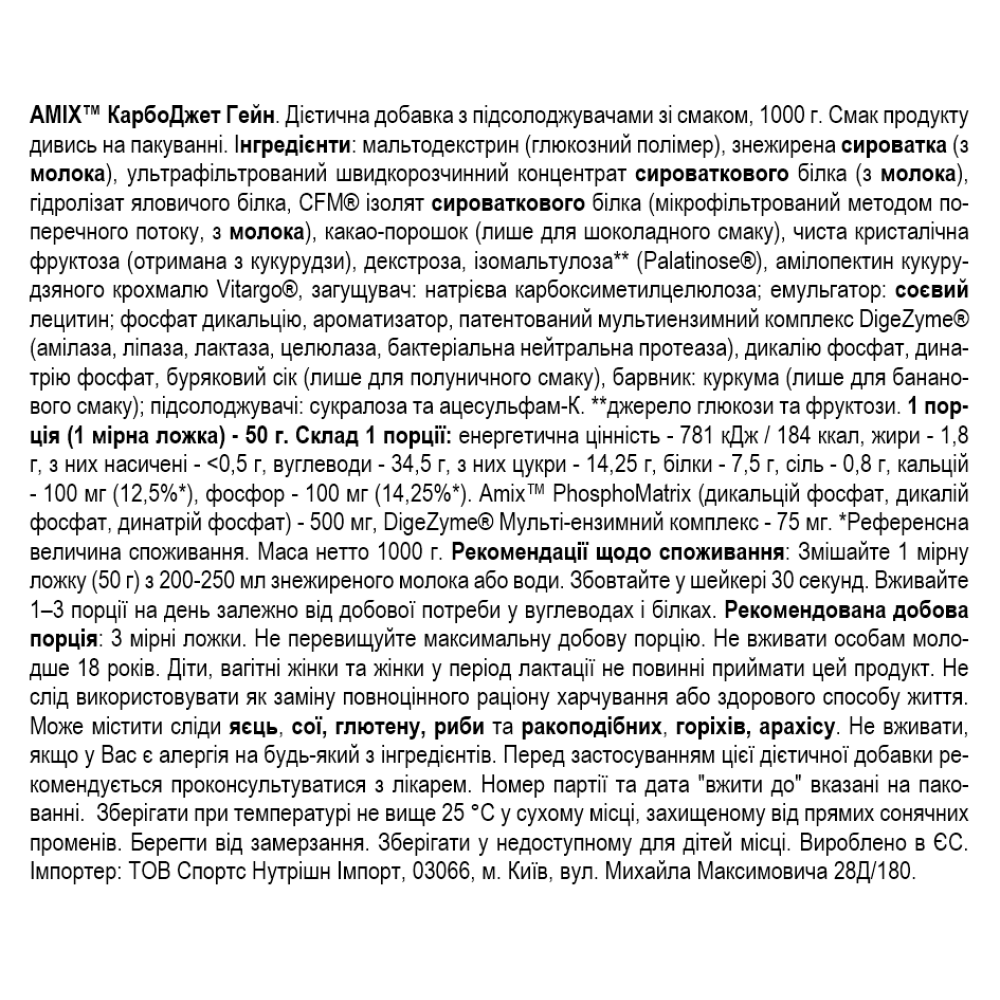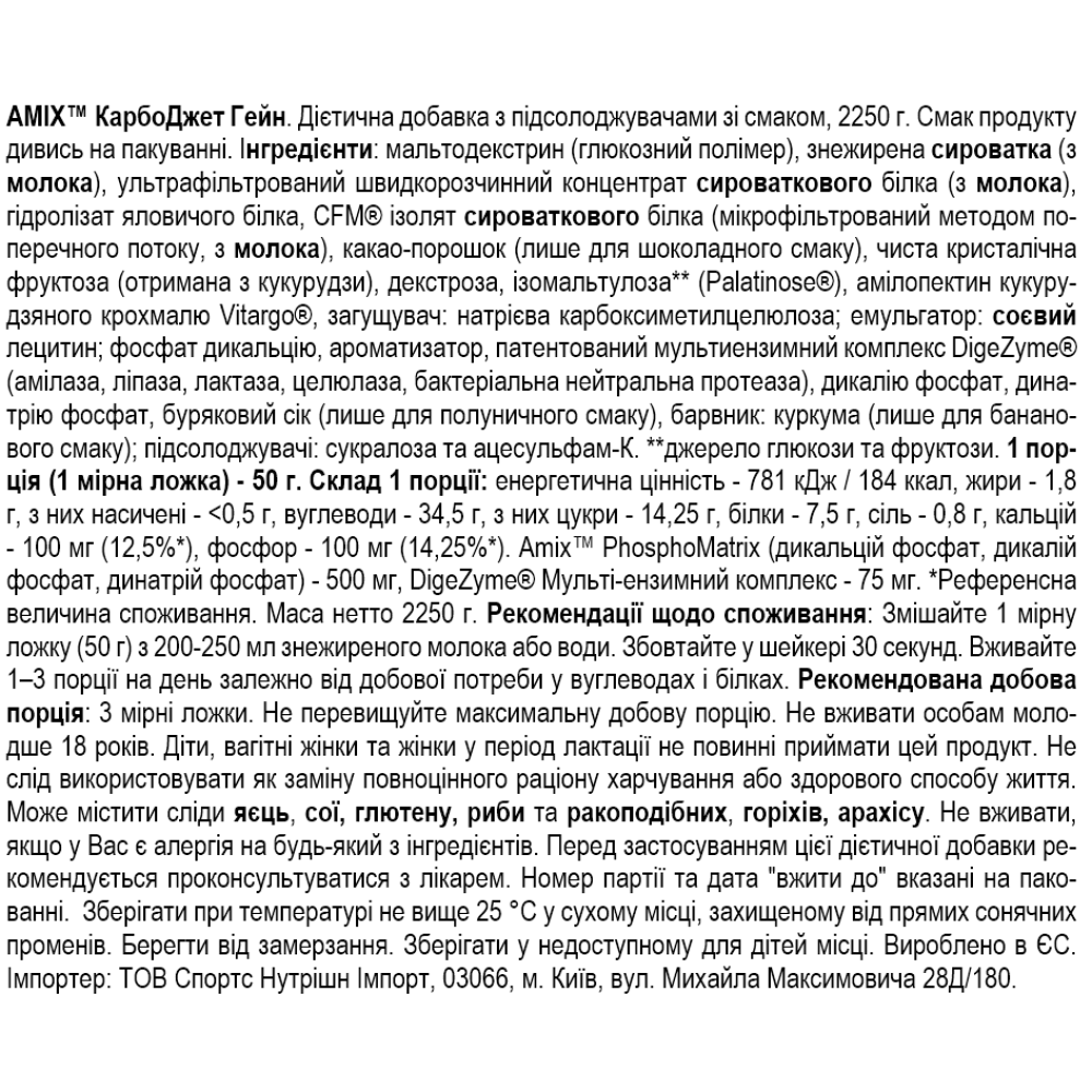 Эта пищевая спортивная добавка- гейнер состоит из микса необходимых компонентов таких как фирменная протеиновая смесь состоящая из изолята сывороточного протеина CFM, ультрафильтрованного концентрата сывороточного протеина, обезжиренного сывороточного протеина и гидролизата говяжьего протеина. Преимуществом данного гейнера является подобранная смесь комплекса углеводов и протеиновой смеси. Данный гейнер подходит для людей ведущих активный образ жизни.