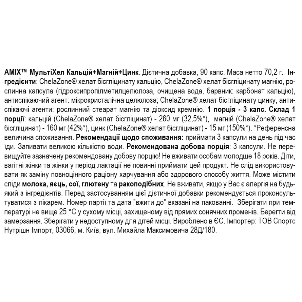 Состав Amix ChelaZone MultiChel Ca+Mg+Zn Bisglycinate Chelate - 90 веган капс