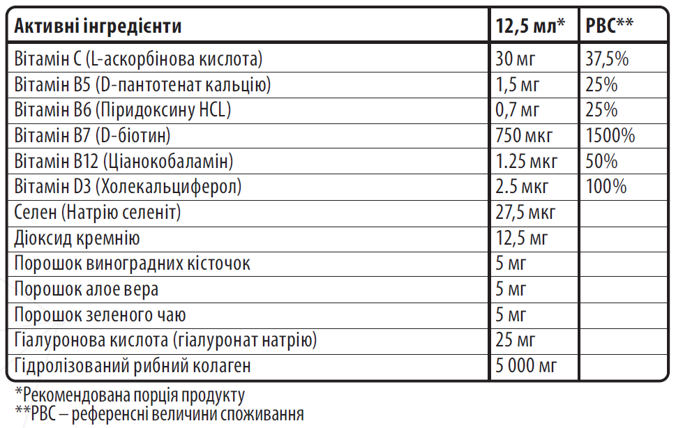 Состав: фильтрованная вода, гидролизованный рыбный коллаген типа 1 и 3 (пептиды гидролизованного коллагена содержат аминокислоты: L-глицин, L-пролин, L-аланин, L-гидроксипролин, L-глутаминовая кислота, L-аргинин, L-аспарагиновая кислота, L-серин, L-лизин, L-лейцин, L-валин, L-треонин, L-фенилаланин, L-изолейцин, L-гидроксилизин, L-метионин, L-гистидин, L-тирозин, L-цистеин), L-аскорбиновая кислота, гиалуронат натрия, натуральный ароматизатор (натуральные ягоды), природный цвет (натуральный порошок пурпурного картофеля), диоксид кремния, консерванты (сорбат калия, бензоат натрия), порошок алоэ вера, порошок виноградных косточек, порошок зеленого чая, D-пантотенат кальция, D-биотин, пиридоксин HCL, подсластители (цикламат натрия, сахаринат натрия) регулятор кислотности (лимонная кислота), подсластитель (гликозиды стевиола), холекальциферол, натрия селенит, цианокобаламин.