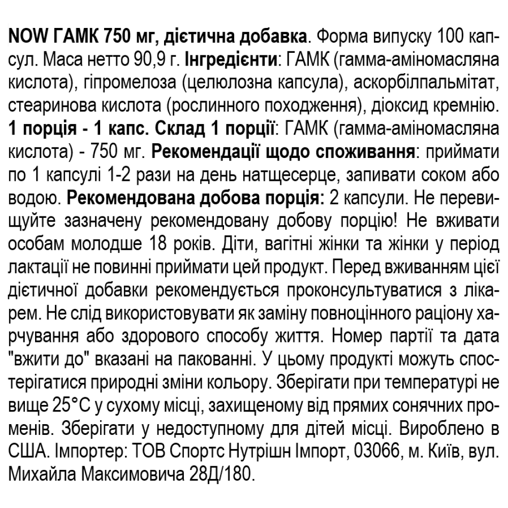 NOW Foods GABA 750 mg (ГАМК) – гамма-аминомасляная кислота это главный тормозной нейромедиатор центральной нервной системы (ЦНС). То есть поддерживает процессы торможения и возбуждения в равновесии, это в свою очередь положительно влияет на умственную деятельность и нормализацию цикла сна (глубокий спокойный сон).