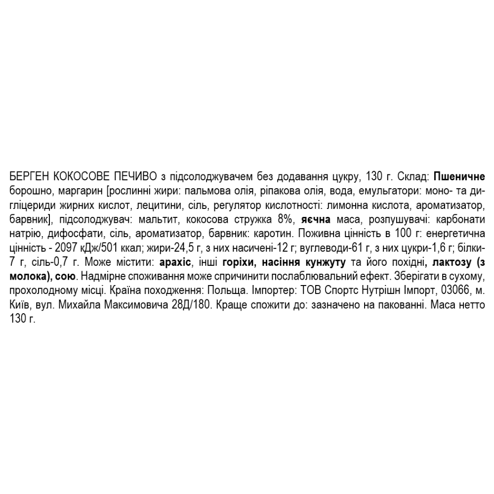 Ингредиенты: пшеничная мука, маргарин [растительные жиры: пальмовое масло, рапсовое масло, вода, эмульгаторы: моно- и диглицериды жирных кислот, лецитины, соль, регулятор кислотности: лимонная кислота, ароматизатор, краситель], подсластитель: мальтит, кокосовая стружка 8%, цельное яйцо, разрыхлители: карбонаты натрия, дифосфаты, соль, ароматизатор, краситель: каротины.