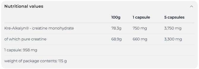 - 3750 мг моногидрата креатина Kre-Alkalyn® в одной порции (5 капсул).