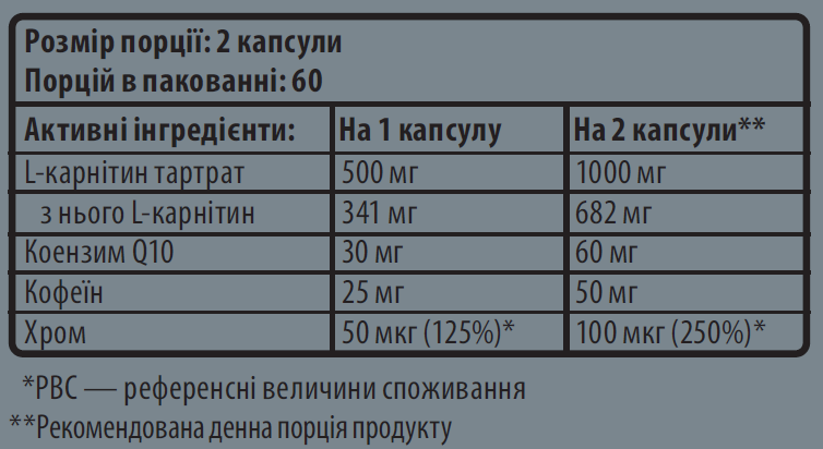 Состав: L-карнитин тартрат, коэнзим Q10, кофеин, хрома пиколинат, оболочка капсулы: желатин; краситель: диоксид титана.