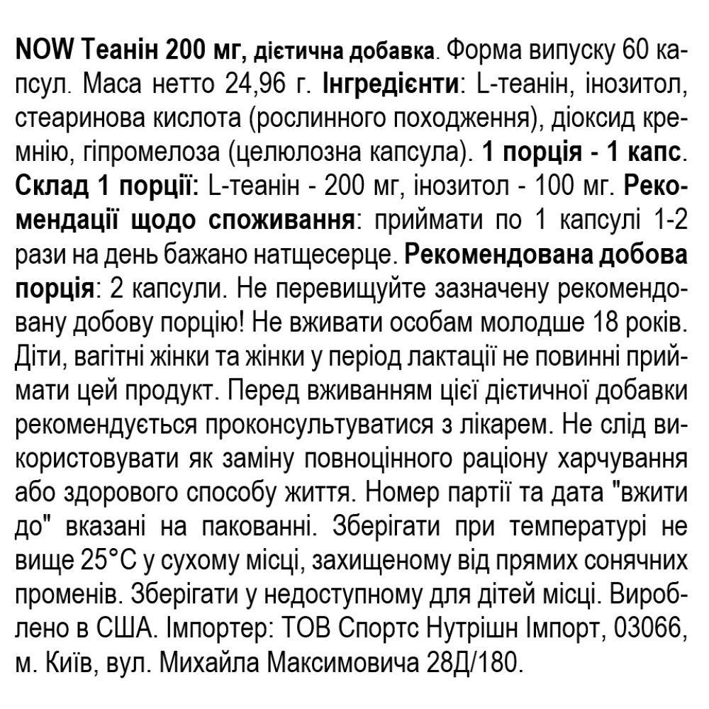 Состав NOW Foods L-Theanine 200 мг - 60 веган капс