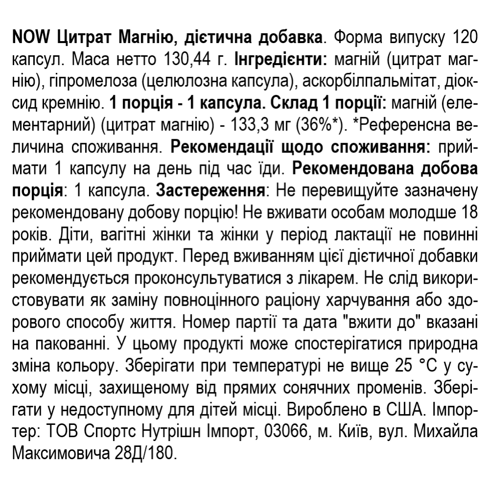 Состав NOW Foods Magnesium Citrate - 120 веган капс