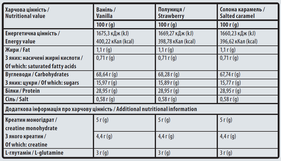Состав: мальтодекстрин, концентрат сывороточного белка (молоко), креатин моногидрат, L-глутамин, ароматизаторы, загуститель: гуаровая камедь, эмульгатор: карбоксиметилцеллюлоза натрия, соль, подсластители: сукралоза, ацесульфам-к.