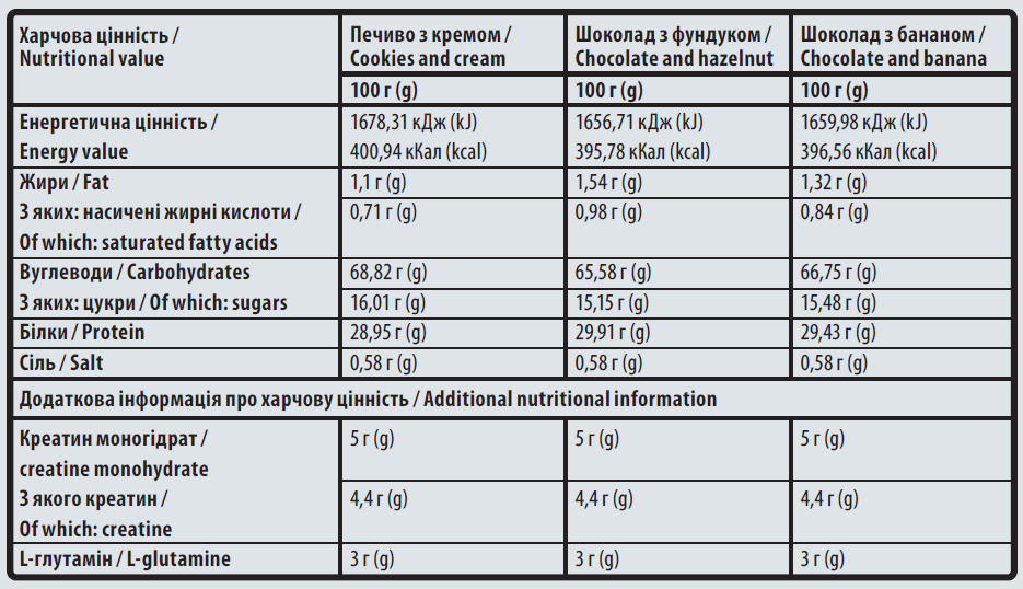Состав: мальтодекстрин, концентрат сывороточного белка (молоко), креатин моногидрат, L-глутамин, какао-порошок, ароматизаторы, загуститель: гуаровая камедь, эмульгатор: карбоксиметилцеллюлоза натрия, соль, подсластители: сукралоза, ацесульфам-к.