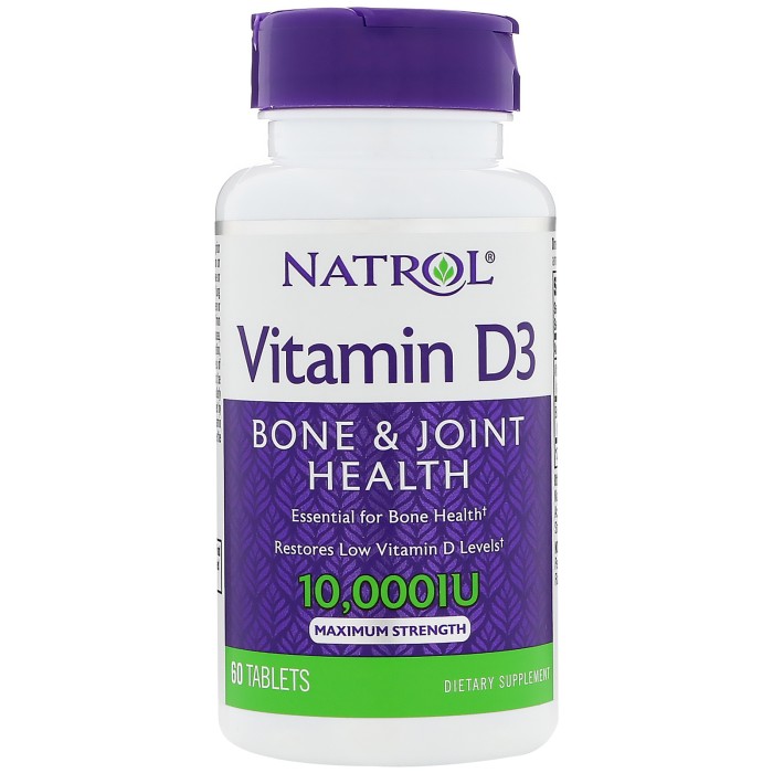 NATROL Vitamin D3 10,000IU - 60 таб. Витамин D3 играет важную роль в организме человека. Он регулирует обмен фосфора и кальция, участвует в формировании костной ткани. Недостаток витамина D3 в организме приведет к недостаточному питанию клеток, хрупкости костей, повышая риск опасности переломов. Особенно нехватка его наблюдается у людей, ведущих активный образ жизни.