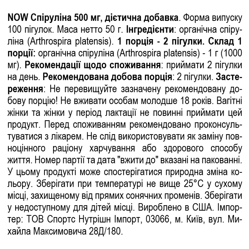 Состав NOW Foods Spirulina 500 мг