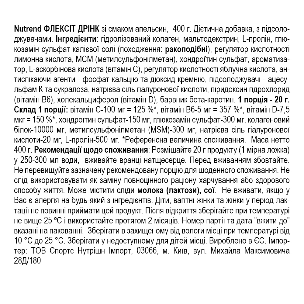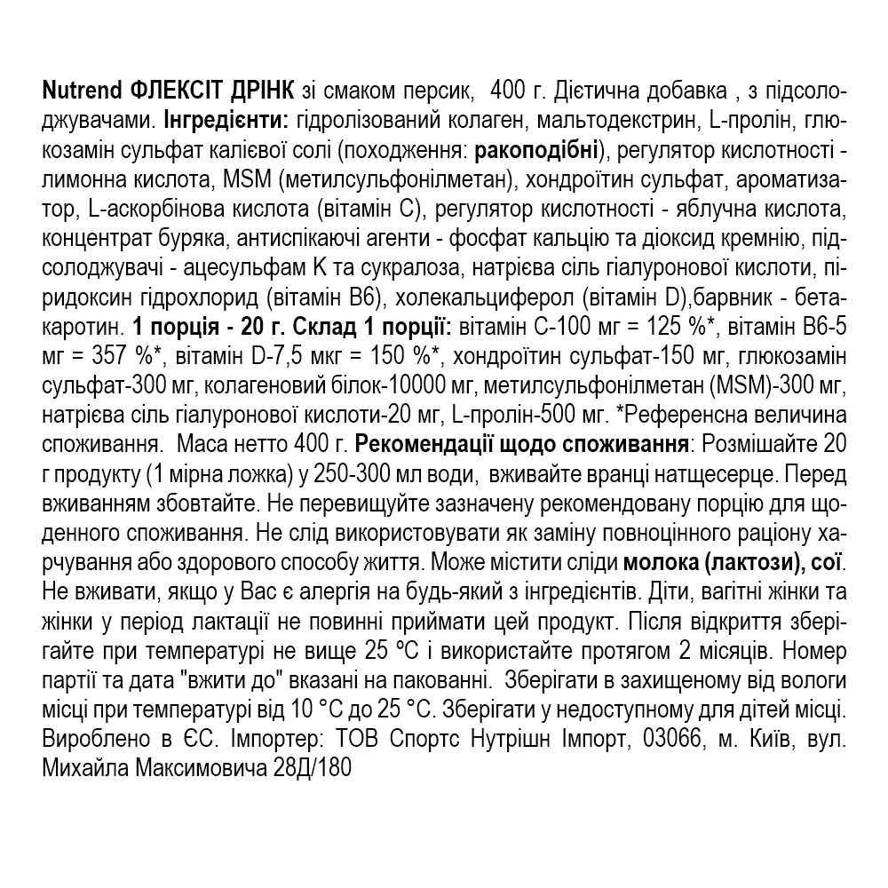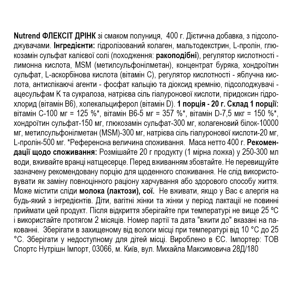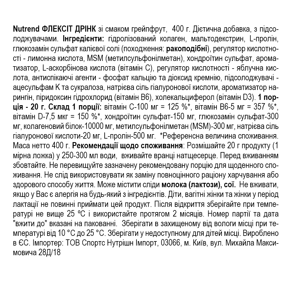 FLEXIT DRINK - предназначен для лиц с повышенным износом суставов (физическая активность, бодибилдинг, пауэрлифтинг). Он состоит из глюкозамина, пролина, хондроитина, МСМ и гиалуриновой кислоты. Это источник коллагена, обогащенный витаминами С, В6 и D. Он также содержит магний. Витамин С способствует нормальному образованию коллагена для правильного функционирования костей и хрящей. Витамин D – нормализует уровень кальция в крови. МСМ способствует образованию коллагена.