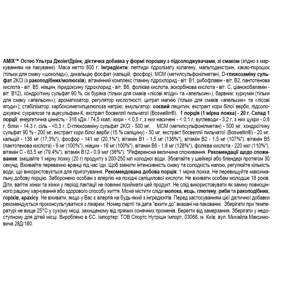 Osteo Ultra GelDrink от Amix – это порошкообразный напиток, разработанный для людей, желающих укрепить свои кости, суставы и связки до, во время и после тренировки. AMIX Osteo Ultra Gel Drink состоит из смеси синергетических ингредиентов, он содержит гидролизат коллагена, глюкозамин и хондроитин сульфат, а также другие дополнительные питательные вещества, такие как МСМ. Жидкая форма добавки улучшает усвоение активных компонентов, а ее отличный вкус делает применение более приятным.