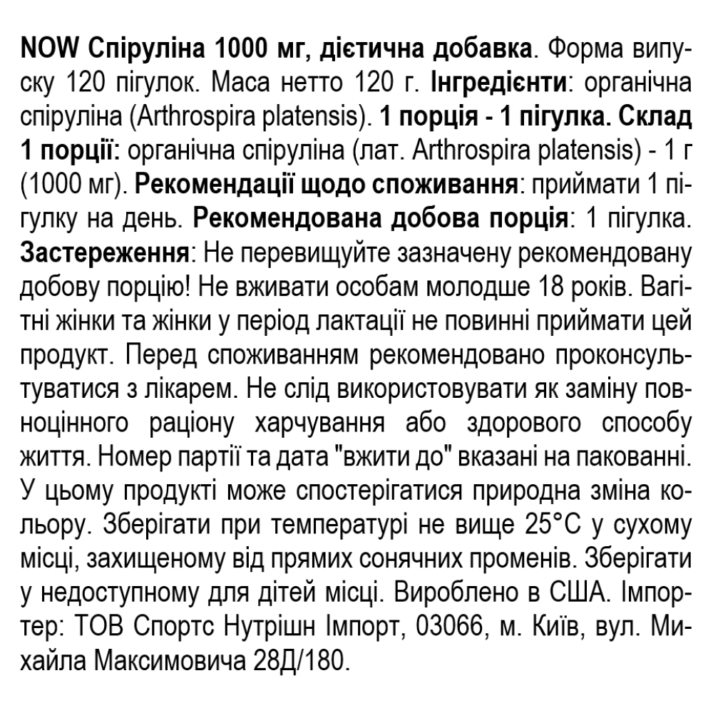 Состав NOW Foods Spirulina 1000 мг