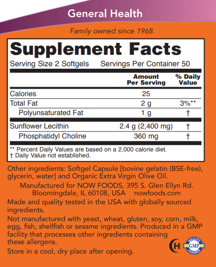 Состав NOW Foods Sunflower Lecithin 1200 мг - 100 софт гель