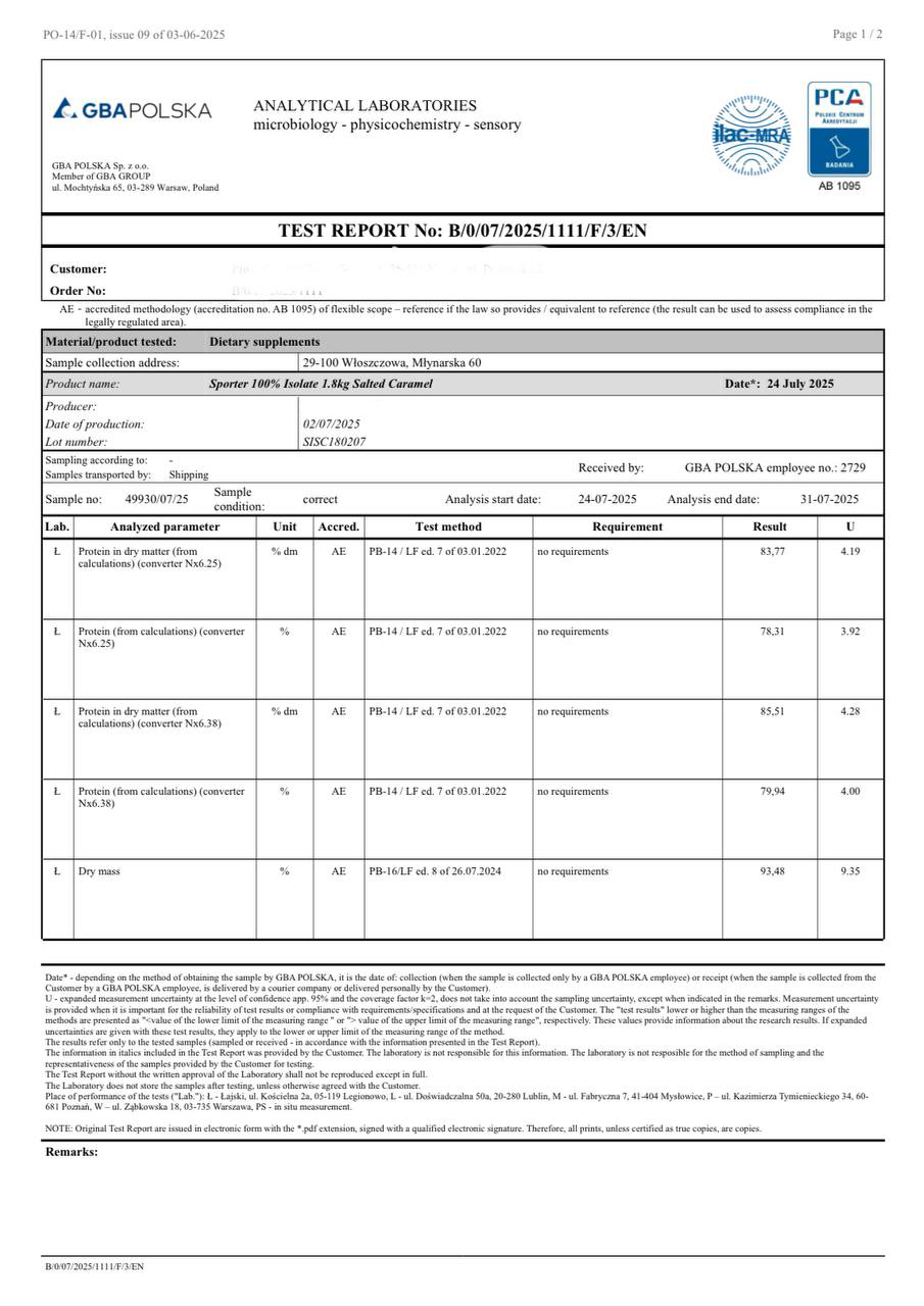 Для підтвердження заявленої якості та складу продукції Sporter 100% Isolate, компанія Спортер (Sporter) провела незалежні лабораторні дослідження в акредитованих європейських лабораторіях — GBA Polska Sp. z o.o.