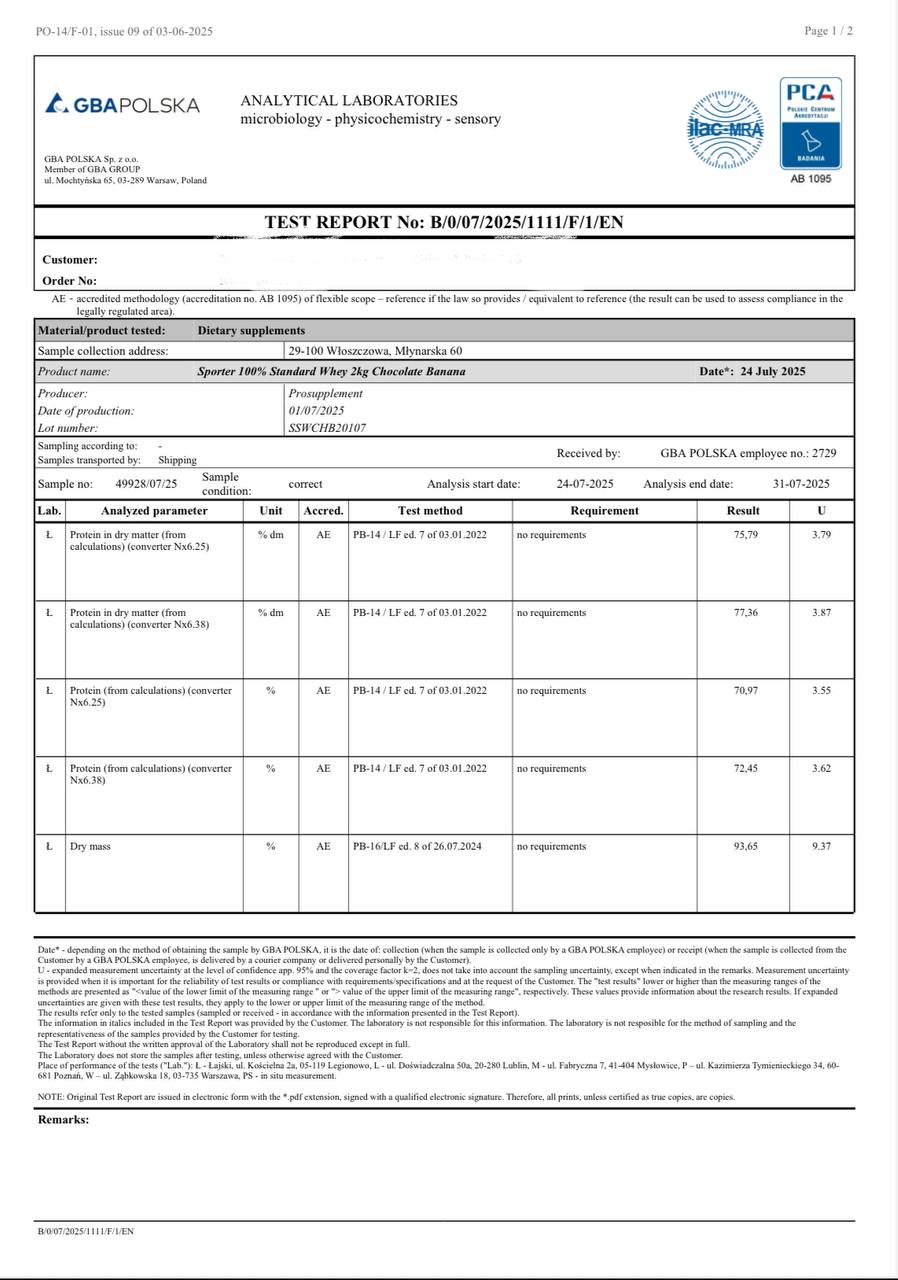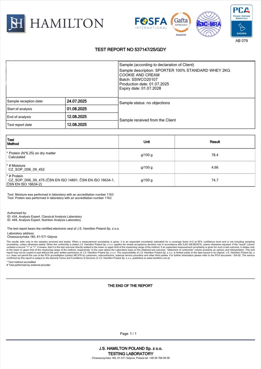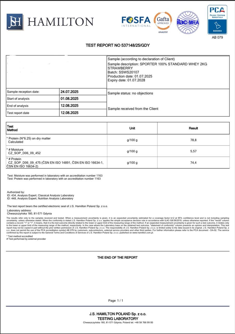 Для підтвердження заявленої якості та складу продукції Sporter 100% Standard Whey, компанія Спортер (Sporter) провела незалежні лабораторні дослідження в акредитованих європейських лабораторіях — GBA Polska Sp. z o.o. та J.S. Hamilton Poland Sp. z o.o.
