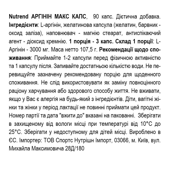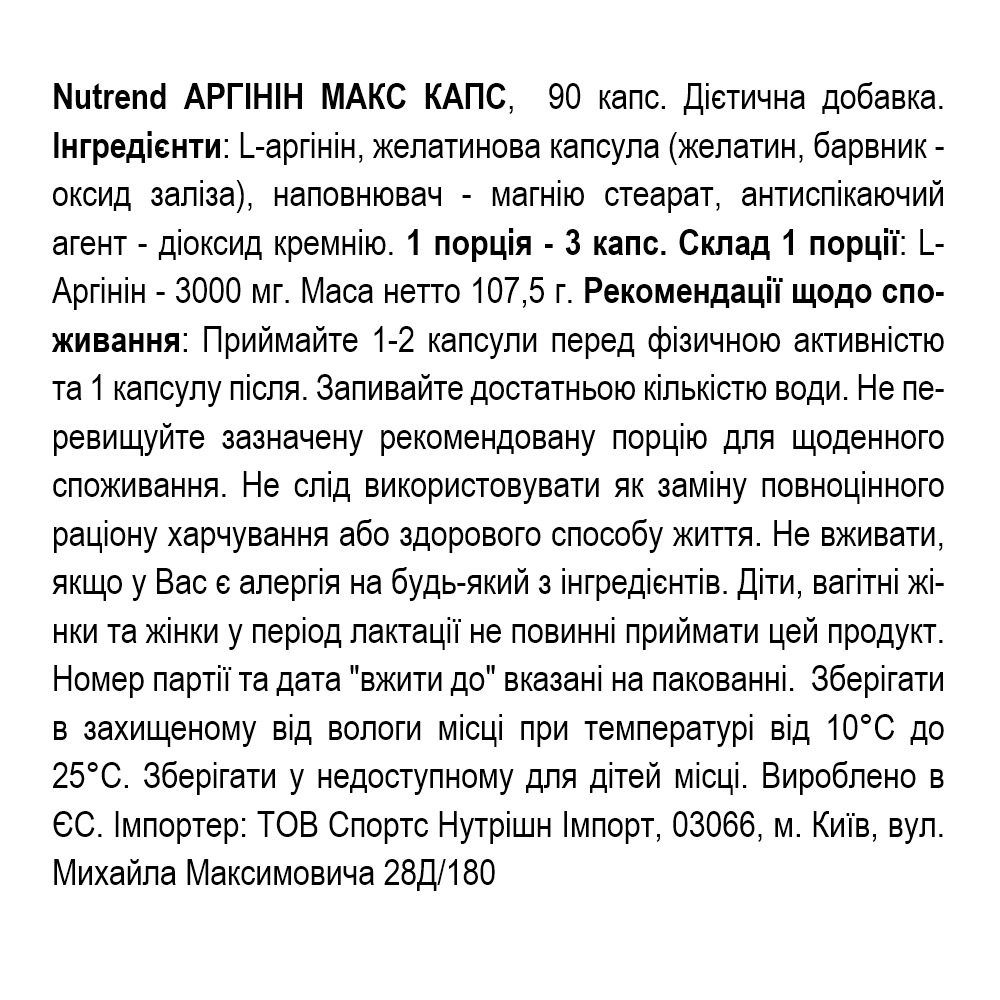 Nutrend Arginine Max – харчова добавка, що містить 1000 мг L-аргініну в кожній капсулі. L-аргінін належить до умовно незамінних амінокислот, які природно зустрічаються у білках та беруть участь у біохімічних процесах організму, зокрема у синтезі білка.