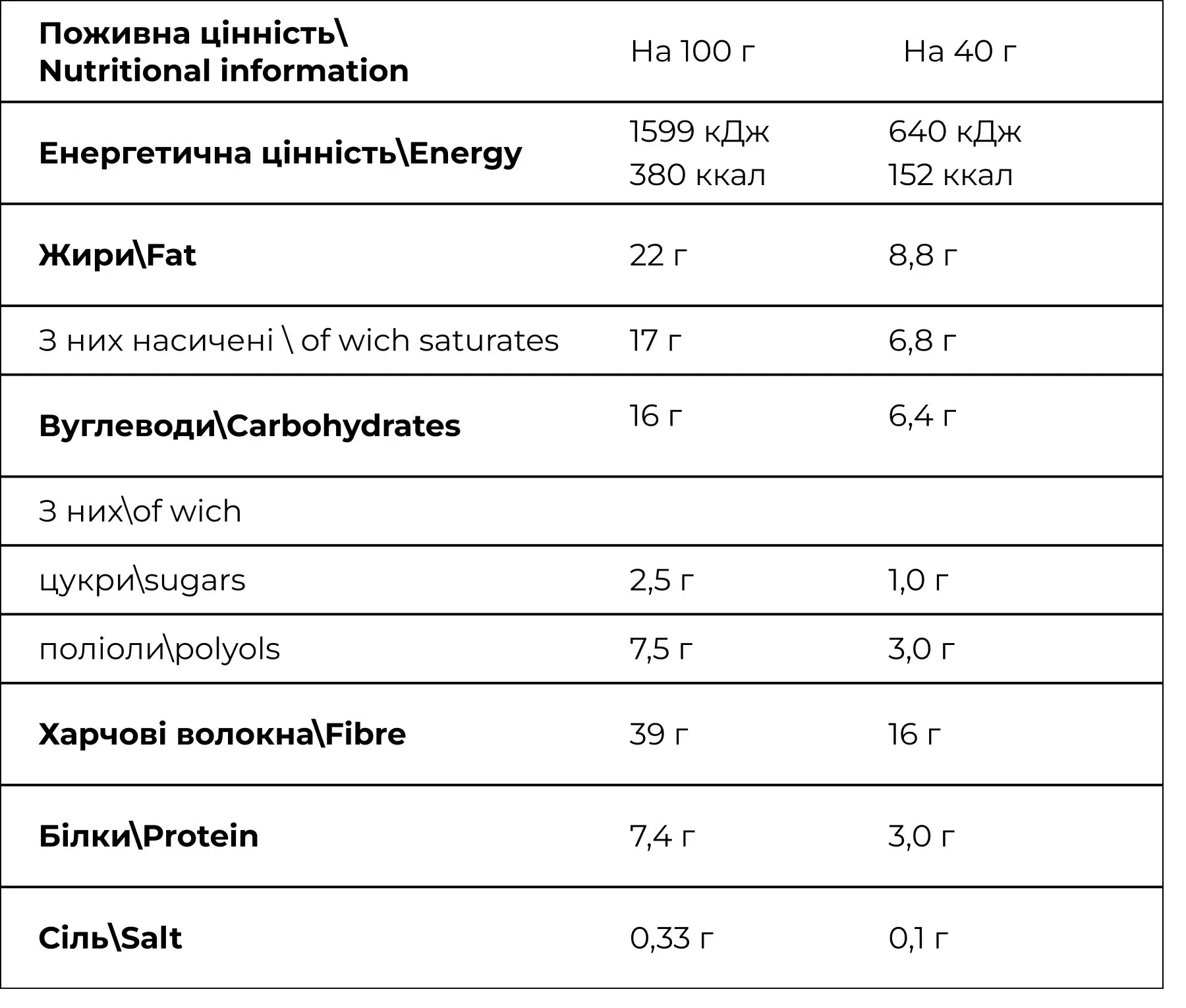 *Батончик не містить доданого цукру. Містить лише природні цукри з молочних та рослинних інгредієнтів у мінімальних кількостях.