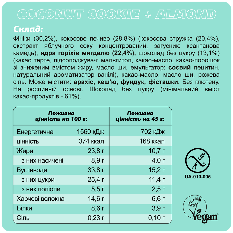 Склад FIZI Батончик Guilty Pleasure - 45 г - кокосове печиво + мигдаль