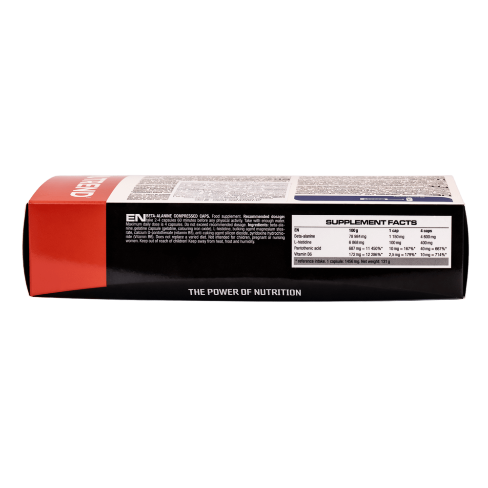 Nutrend Beta Alanine Compressed Caps - це харчова добавка, що містить бета-аланін, L-гістидин, вітаміни B5 і B6. Бета-аланін - це не есенціальна амінокислота, яка в організмі людини перетворюється в карнозин. Карнозин - це дипептид, який міститься в скелетних м'язах і бере участь у регуляції кислотно-лужного балансу в м'язах.