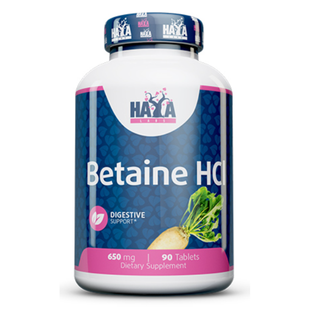 Betaine HCL Haya Labs – це продукт у вигляді зручних для ковтання таблеток, який на 100% складається з бетаїну гідрохлориду. Бетаїну гідрохлорид виробляють із цукрових буряків. Головна діюча речовина даного препарату має гепатопротекторний, ліполітичний, травний ферментний і жовчогінний ефект.
