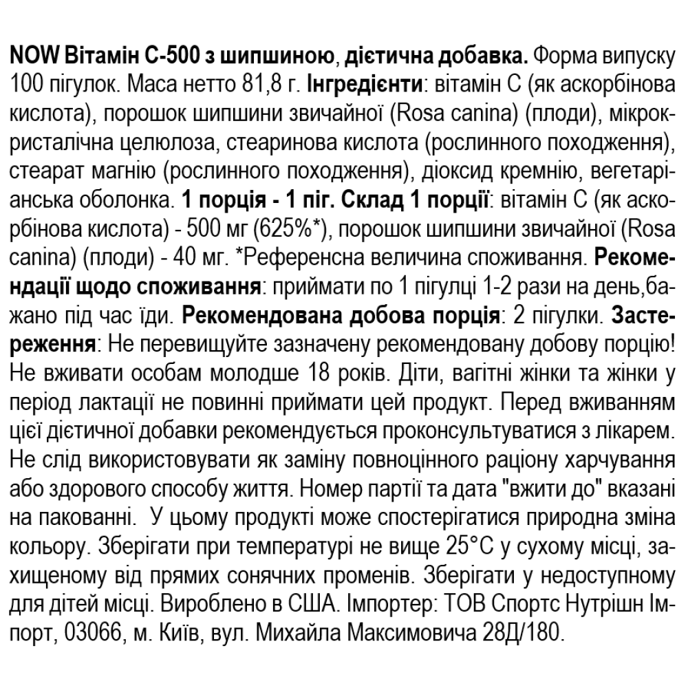 Харчова добавка Вітаміну С на основі витяжки із шипшини. Vitamin C – водорозчинний вітамін, не синтезується людським організмом, тому потреба в ньому зростає в рази, адже дефіцит вітаміну С призводить до різних негативних наслідків (проблемна шкіра, кровоточивість ясен, зниження імунітету, тривале загоєння ран, захворювання цингою та багато іншого)