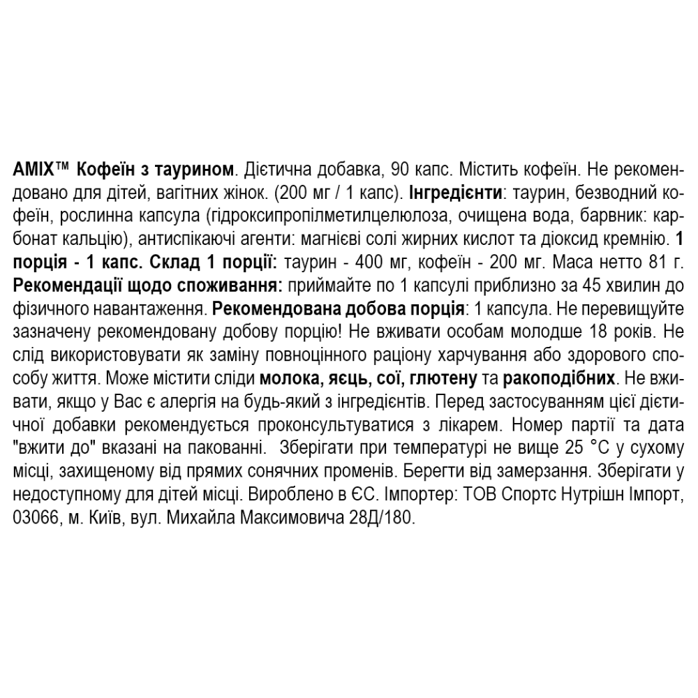 Склад Amix Caffeine 200mg with Taurine - 90 капс
