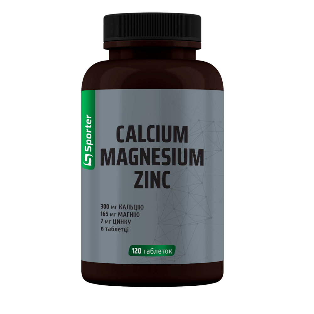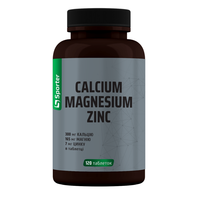 Sporter Calcium magnesium zinc – спеціальна добавка до раціону харчування – джерело кальцію, магнію та цинку, які сприяють зміцненню кісток та опорно-рухового апарату в цілому. Містить оптимальне співвідношення кальцію та магнію для максимального засвоєння цих елементів.