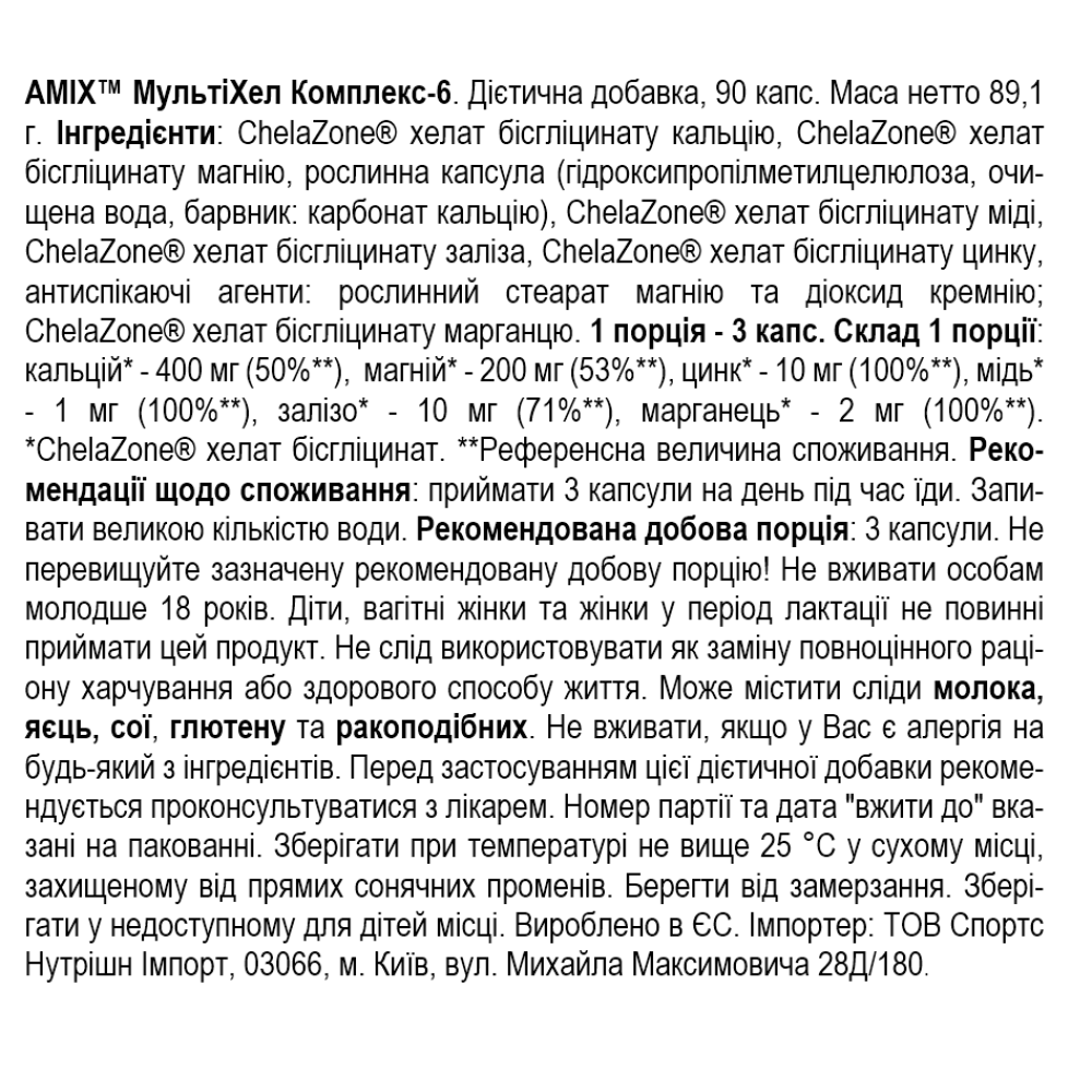 Склад Amix ChelaZone MultiChel Complete 6 Bisglycinate Chelate - 90 веган капс