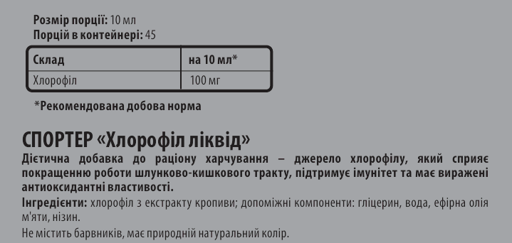 Рідкий хлорофіл сприяє виробленню клітин-еритроцитів, необхідних для детоксикації та зміцнення організму.