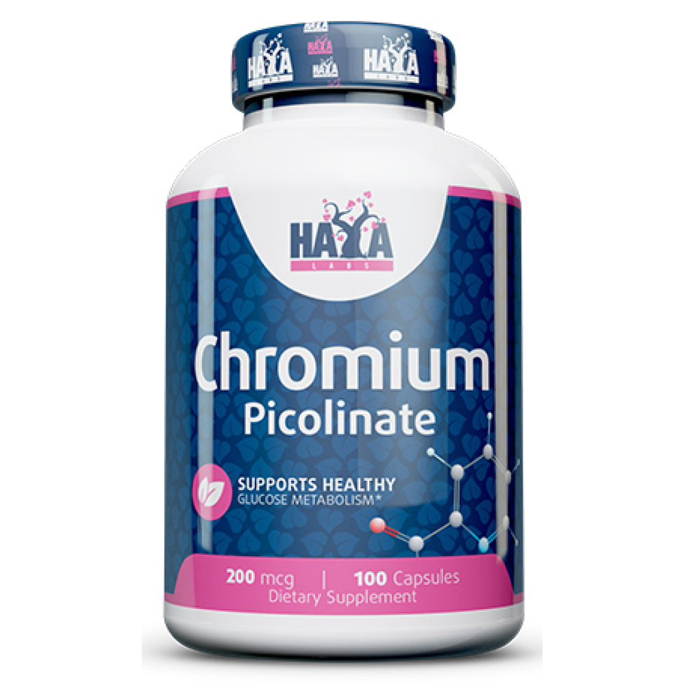 Haya Labs Chromium Picolinate - це харчова добавка з піколінат хрому 200 мг в одній капсулі. Добавка є натуральним продуктом для регулювання рівня цукру в крові при нестабільному рівні глюкози, підвищеному апетиті та надмірній вазі. Хром – дуже важливий мікроелемент для організму. Активує ферменти, що відповідають за вироблення енергії. Він бере участь у вуглеводному обміні, беручи участь у поєднанні GTF (фактор толерантності до глюкози). Поживні речовини, пов'язані з ним, значно впливають на баланс цукру в крові. Основна функція GTF полягає в підтримці дії інсуліну, що відповідає за транспортування глюкози в клітини та перетворення її на енергію. Оскільки він бере участь у контролі рівня цукру в крові, хром має значні переваги для людей із діабетом 2 типу. Він необхідний для нарощування м'язової маси та спалювання зайвого жиру, а також допомагає організму правильно використовувати вуглеводи. Він також допомагає підтримувати зір - встановлений зв'язок дефіциту хрому з розвитком глаукоми та інших захворювань очей. Хром також уповільнює втрату кальцію та знижує ризик втрати кісткової маси у жінок у період менопаузи. Підтримує нормальний стан судин та серцево-судинної системи.