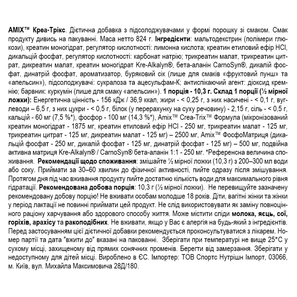 Унікальний креатиновий комплекс Crea-Trix від Amix подарує Вам енергію для складних тренувань. За дотримання рекомендованого дозування креатин збільшує фізичну працездатність у послідовних короткострокових інтервалах високоінтенсивних фізичних навантажень.