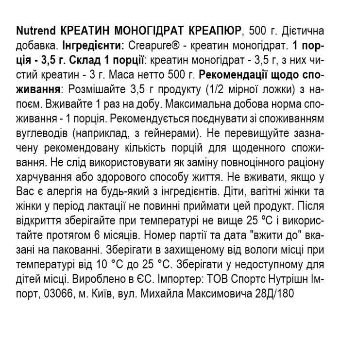 Креатин моногідрат Creapure від Nutrend – це високоефективна харчова добавка, призначена для підвищення силових показників та набору м'язової маси.