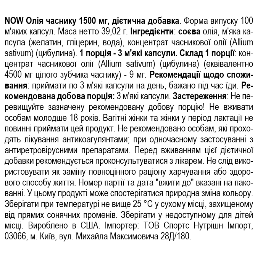 Garlic Oil від NOW – це концентрована часникова олія витягується з цибулин посівного часнику (Allium sativum). Одна порція (3 капс) містить еквівалент цілого зубчика часнику без додаткових наповнювачів.