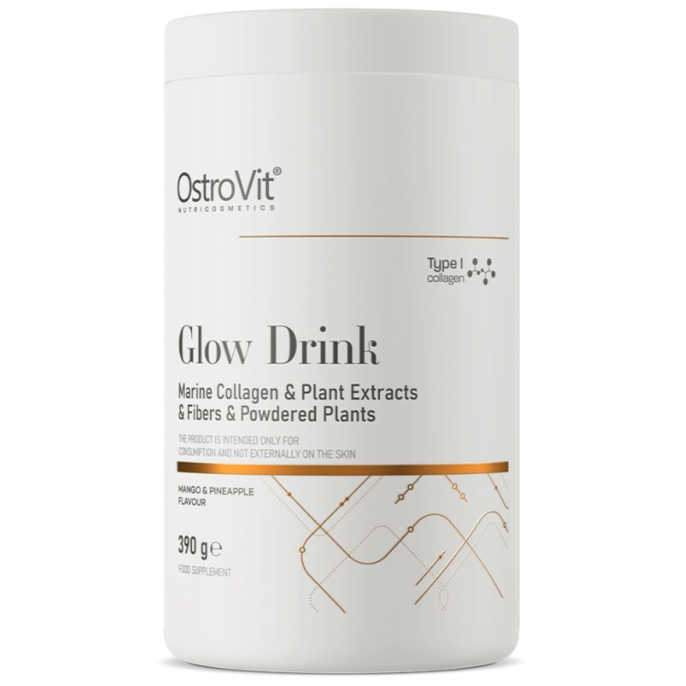 OstroVit Glow Drink - це комплексна харчова добавка в порошковій формі, розроблена для підтримки здоров'я шкіри, волосся і нігтів. Вона містить 18 активних інгредієнтів, включаючи колаген, гіалуронову кислоту, вітаміни, мінерали, рослинні екстракти та інші корисні речовини. Продукт доступний зі смаком манго та ананаса.