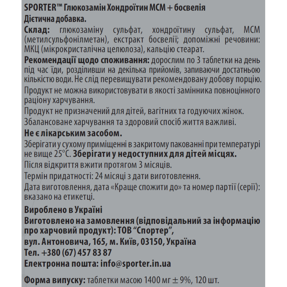 Sporter Glucosamine Chondritin MSM + Boswellia - 120 таб