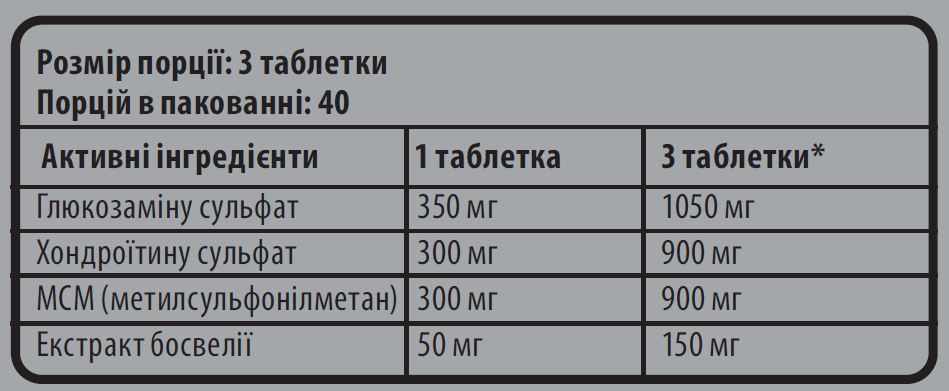 Склад: глюкозаміну сульфат, хондроїтину сульфат, МСМ (метилсульфонілметан), екстракт босвелії; допоміжні речовини: МКЦ (мікрокристалічна целюлоза), кальцію стеарат.