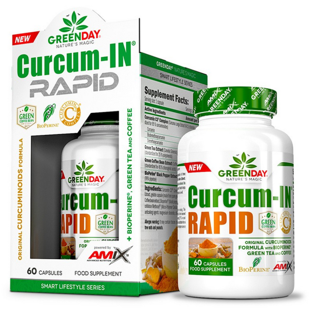 Amix Green Day® Curcum-IN® Rapid – це запатентована формула з трьох куркуміноїдів, збагачена екстрактами зеленого чаю та зелених кавових зерен. Також був доданий BioPerine® для підвищення біодоступності куркуміну.