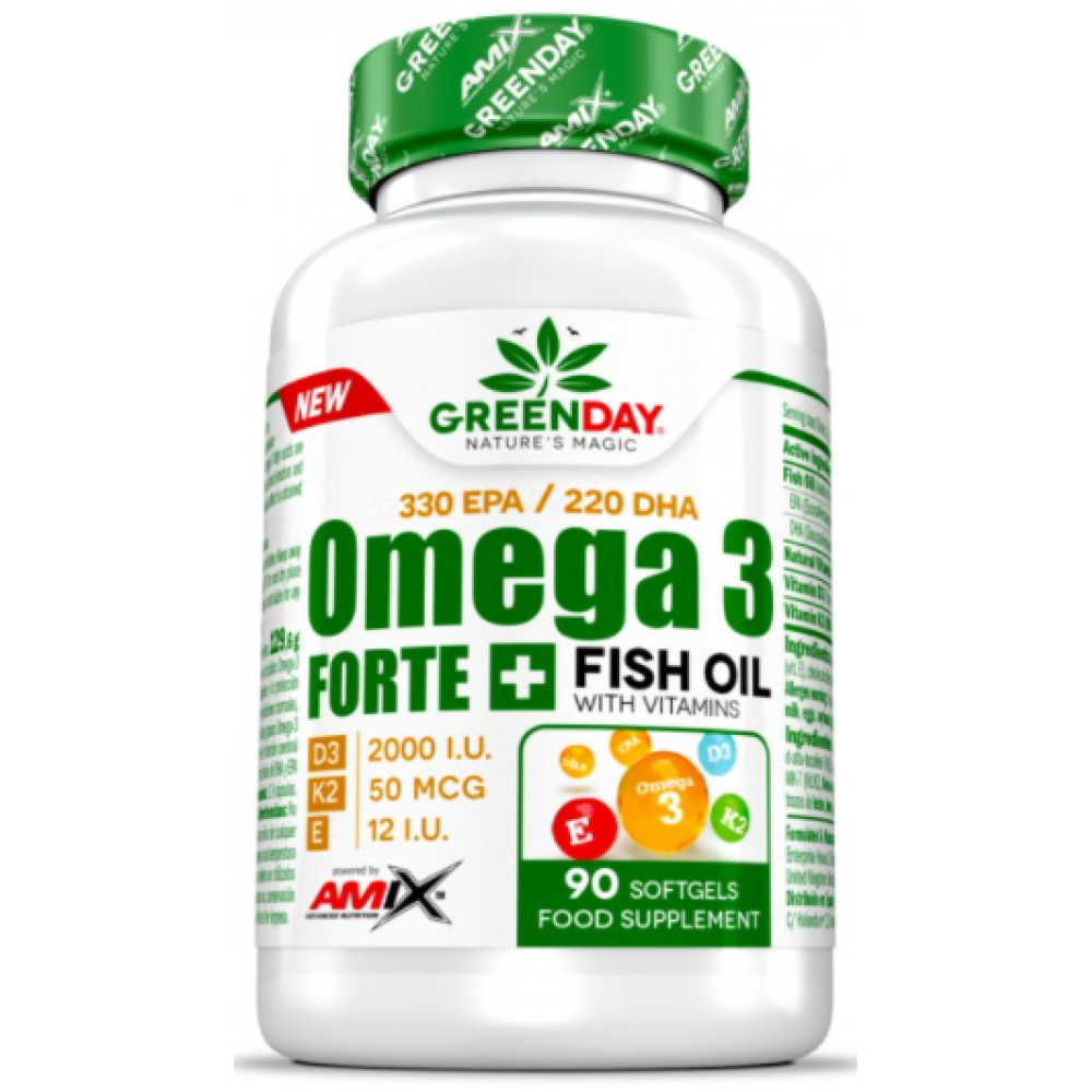 Amix Greenday Omega 3 Forte + має одну з найповніших формул вмісту великої кількості незамінних жирних кислот DHA та EPA. Крім того, для подальшого поліпшення його складу він був збагачений 3 типами вітамінів D3, K2 і E. Дія цих вітамінів посилює переваги Омега 3 і відіграють важливу роль як антиоксиданти, які, крім багатьох інших функцій, беруть участь у регуляції рівня кальцію в кістках. Добова доза DHA та EPA, необхідна для досягнення позитивного ефекту, складатиме від 250 мг.