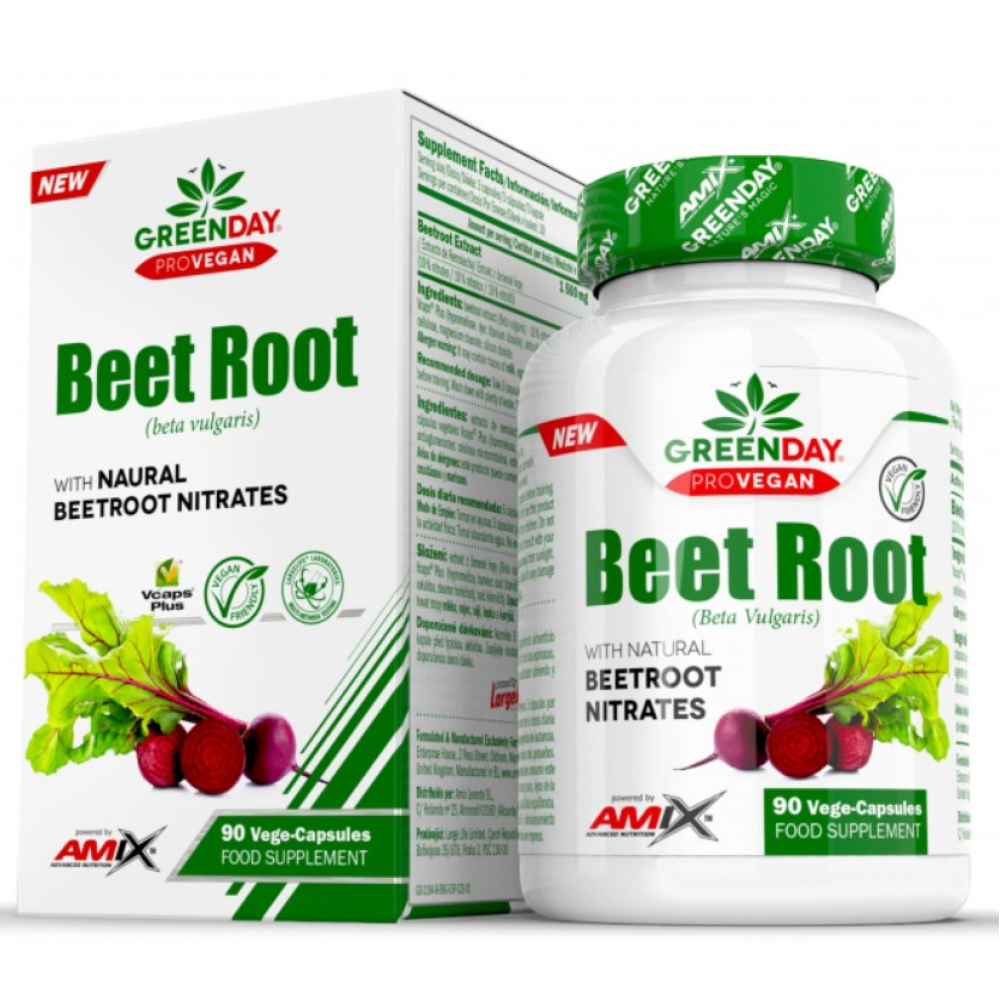GreenDay ProVegan Beet Root від Amix - це добавка на основі екстракту буряків, багата нітратами, що підвищує синтез та засвоєння азоту та кисню в організмі. Нітрати буряків діють як судинорозширювальний засіб, що допомагає також нормалізувати рівень артеріального тиску. Нітрати є природною частиною різних видів овочів, і їх найбільший вміст міститься, наприклад, у шпинаті, салаті та буряках.