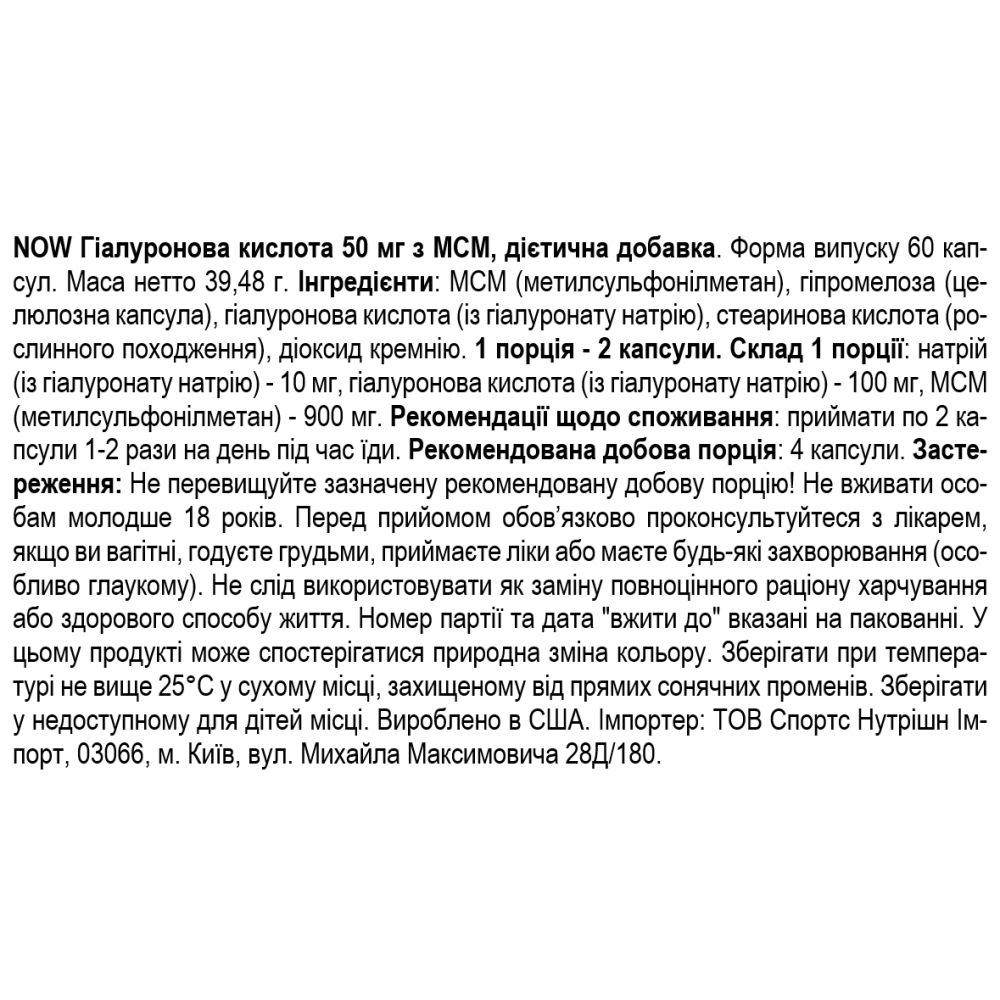 Склад NOW Foods HYALURONIC ACID 50 мг + MSM 60 веган капс