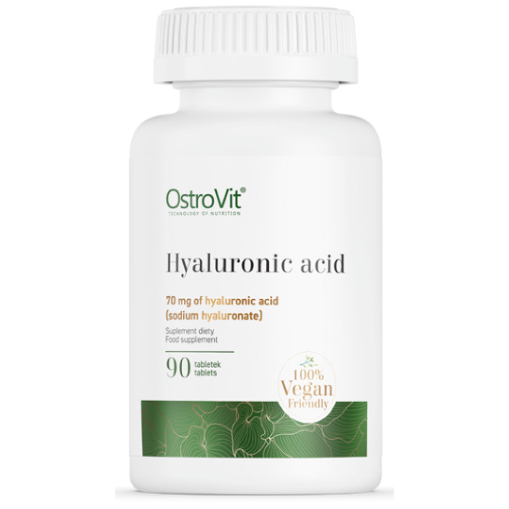 OstroVit Hyaluronic acid - це харчова добавка в таблетках, що доповнює раціон гіалуронової кислоти. Це гелеподібна молекула, яка зв'язує воду. Він діє як амортизуючий та заповнюючий агент для міжклітинних просторів у всіх ссавців. Пом'якшує суглоби, зволожує шкіру та волосся. Це може підвищити еластичність шкіри, а також сприяти покращенню посттравматичного одужання.
