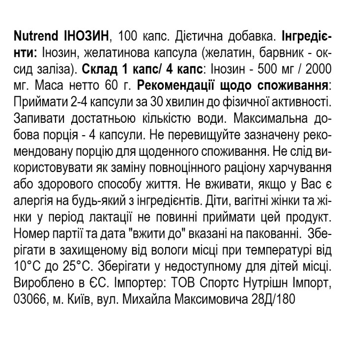 Nutrend Inosine - це харчова добавка, що містить інозин, природну для організму амінокислоту. Інозин є попередником аденозинтрифосфату (АТФ), який є основним джерелом енергії для клітин організму, в тому числі і для м'язових клітин.