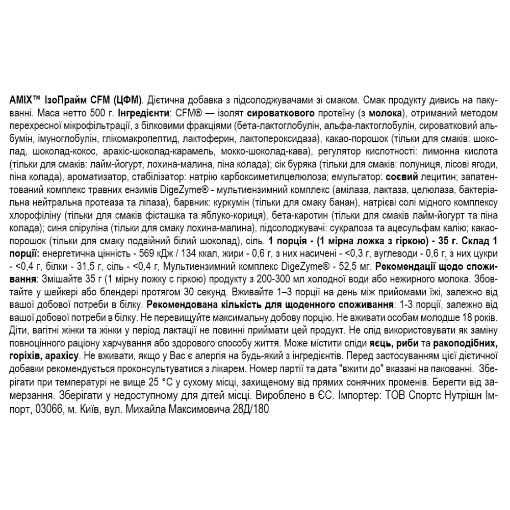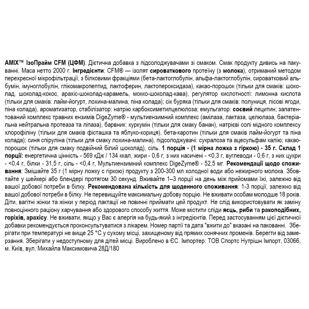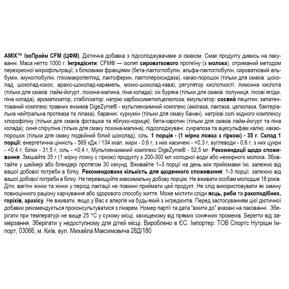 Ingredients: CFM® - Cross Flow Microfiltered Whey Protein Isolate /from milk/ with protein fractions (Beta-Lactoglobulin, Alfa-Lactoglobulin, Bovine Serum Albumin, Immunoglobulin, Glycomacropeptide, Lactoferrin, Lactoperoxidase), cocoa powder (only in chocolate flavours and cookies cream flavour), aroma, stabilizers: xanthan and guar gum; emulsifier: soya lecithin; dye: (pinacolada flavour: beetroot extract and curcumin; banana flavour: curcumin; strawberry and forest fruits flavour: beetroot extract; apple&cinnamon and pistachios flavour: copper complexes of chlorophyll; patented digestive enzyme DigeZyme® - multienzyme complex (Amylase, Lipase, Lactase, Cellulase, Bacterial neutral protease), sweeteners: sucralose Splenda®, acesulfame-K